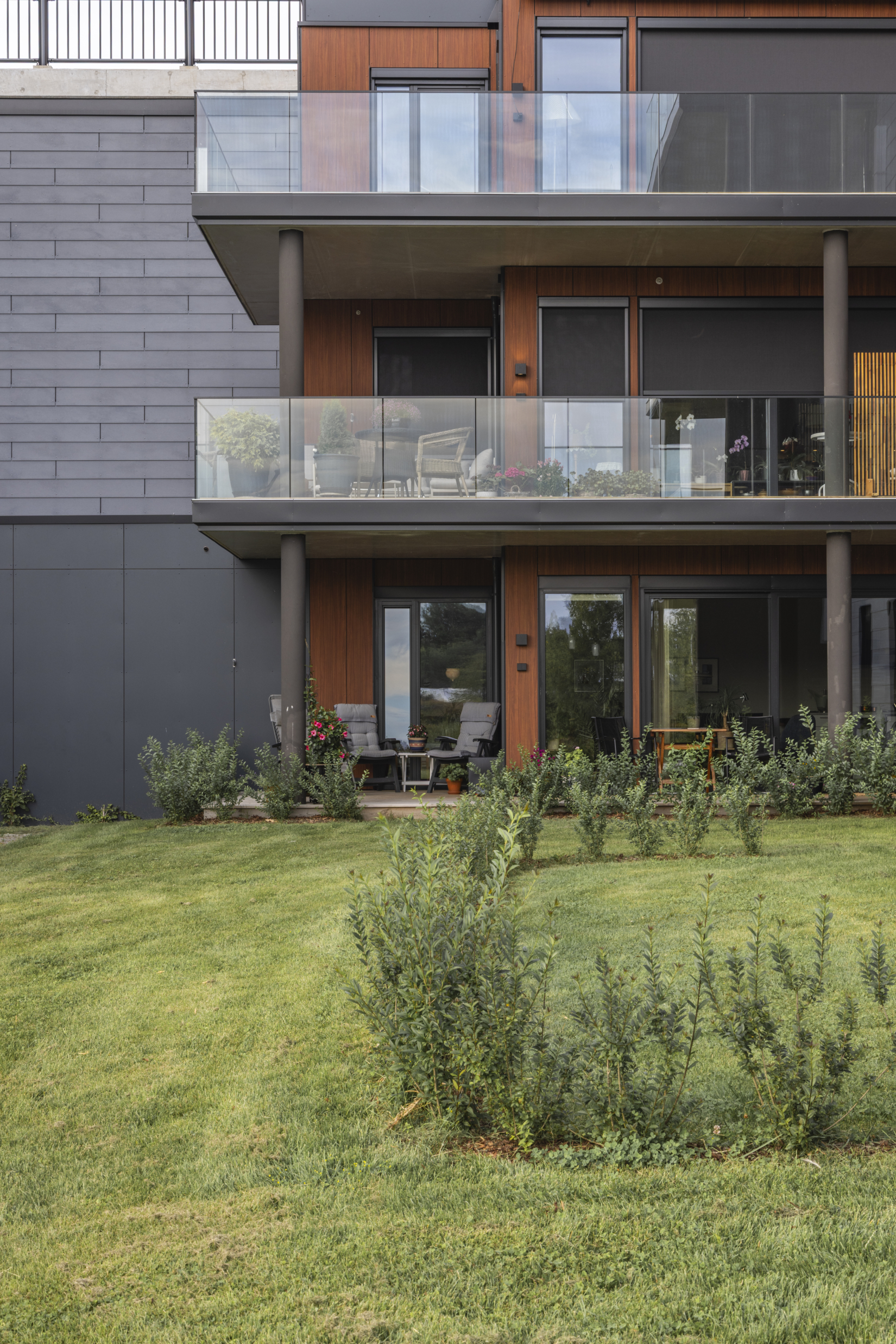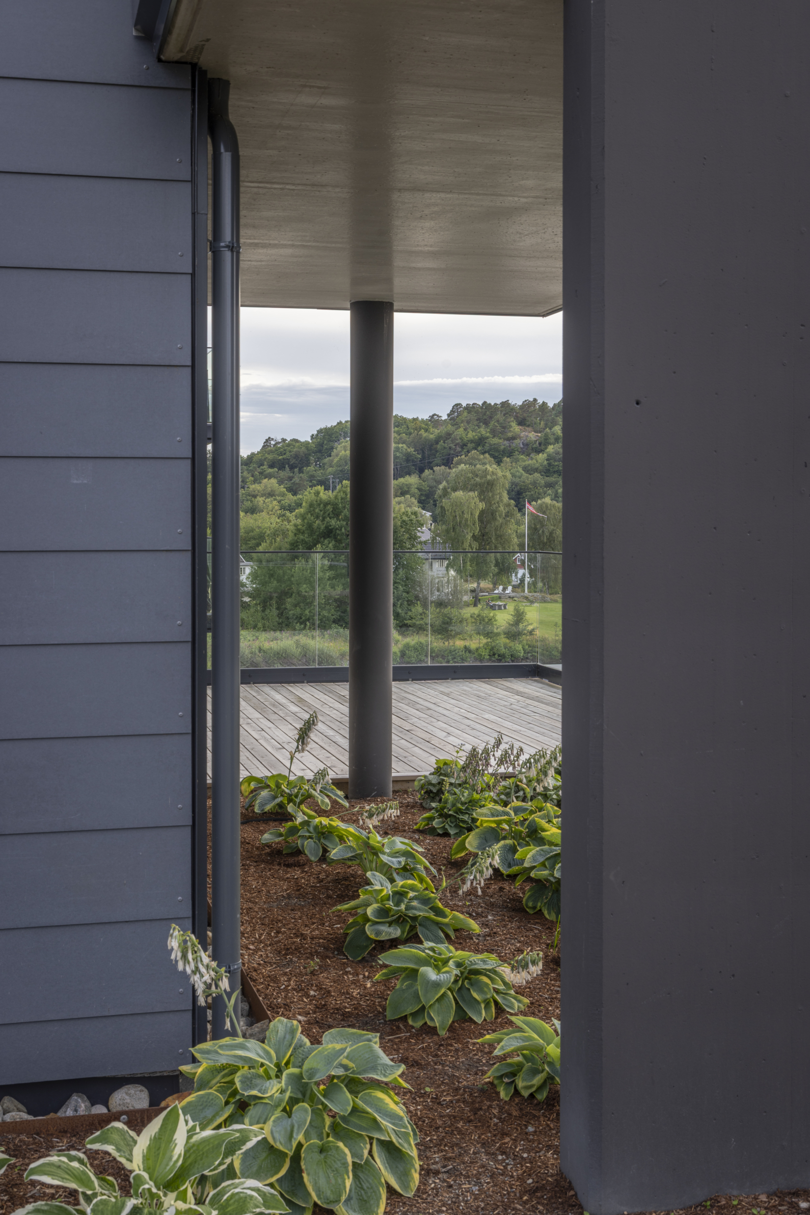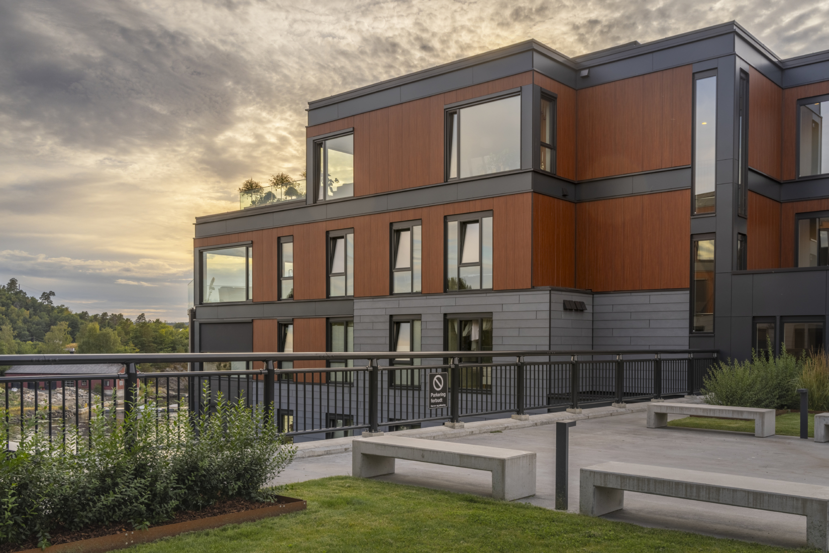 Fasadeoppbyggingen og materialbruk understreker reguleringsplanens krav til bygningsmessig avtrapning, og gir dessuten flotte solfylte terrasser mot sørvest. Med referanse til bergknausene på tomten, kles den nederste delen av bygningskroppen med fasadeplater som har skifer/granittfarget overflate. Dette sammenstiller vi med brune bånd i byggets øverste etasjer. Kombinert med takutstikk gir spillet mellom byggets grå og brune elementer letthet, varme og karakter.