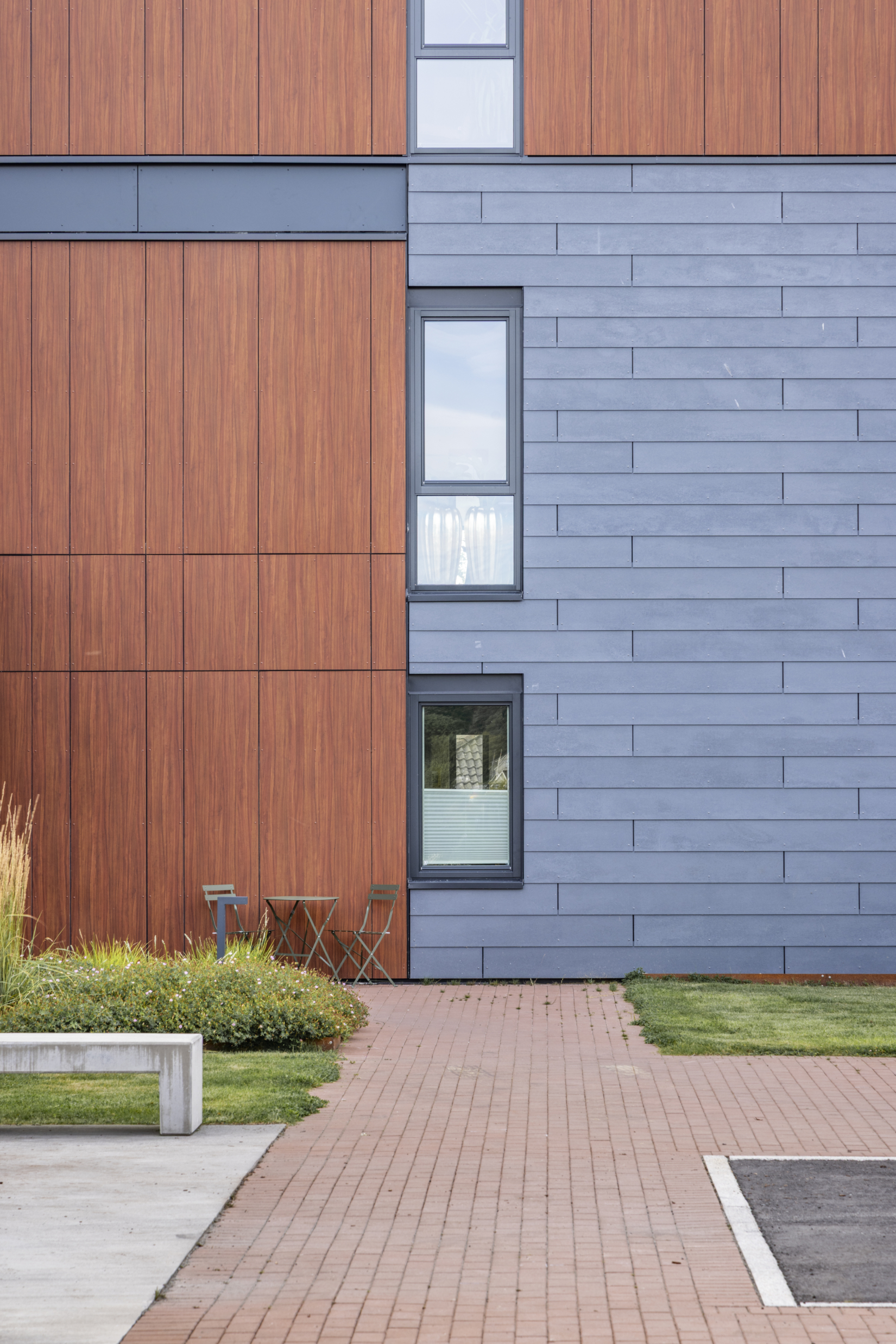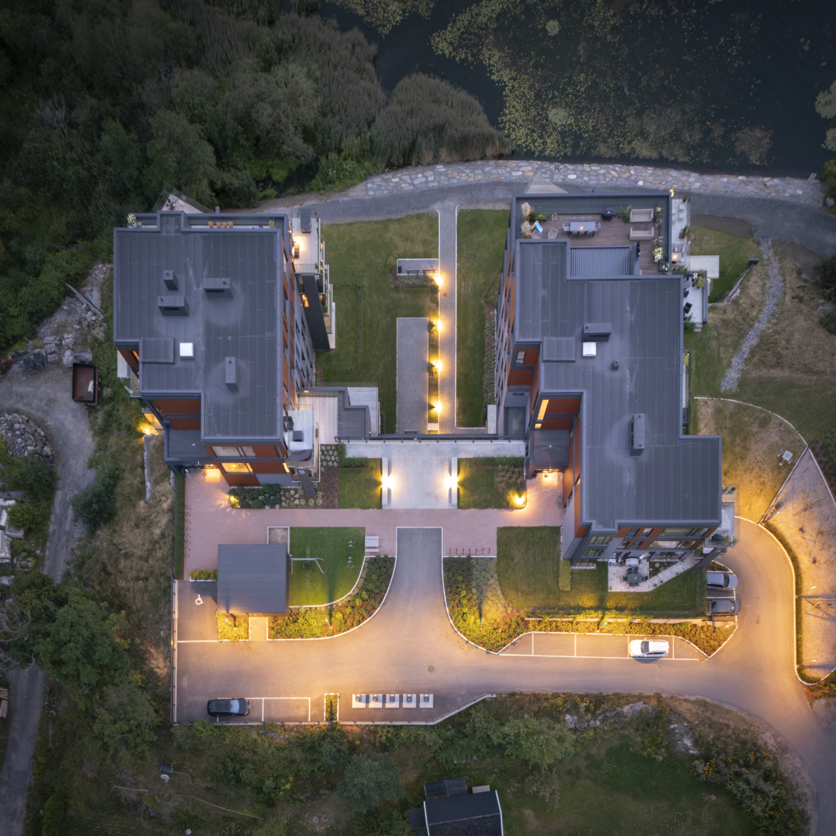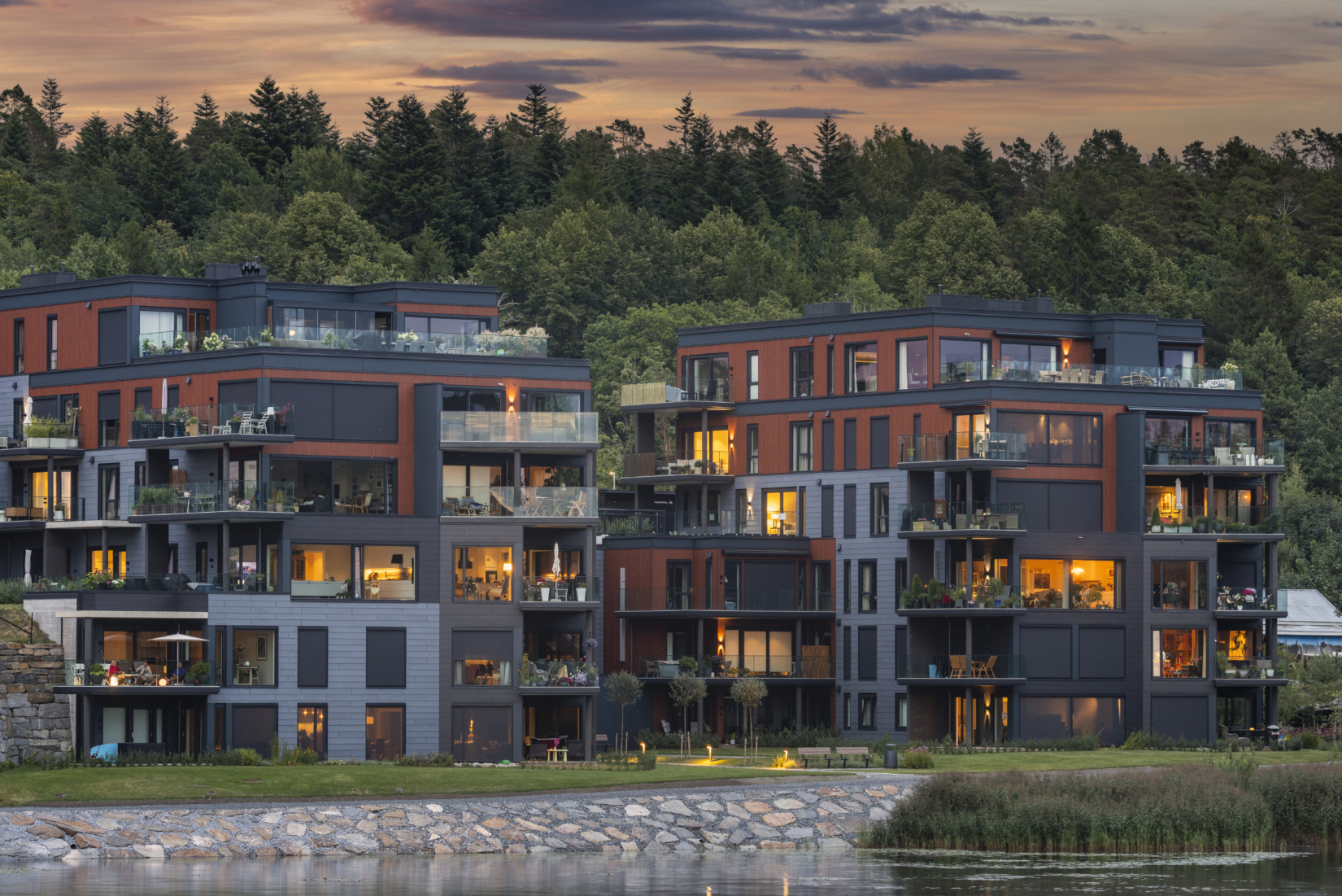 Fasadeoppbyggingen og materialbruk understreker reguleringsplanens krav til bygningsmessig avtrapning, og gir dessuten flotte solfylte terrasser mot sørvest. Med referanse til bergknausene på tomten, kles den nederste delen av bygningskroppen med fasadeplater som har skifer/granittfarget overflate. Dette sammenstiller vi med brune bånd i byggets øverste etasjer. Kombinert med takutstikk gir spillet mellom byggets grå og brune elementer letthet, varme og karakter.