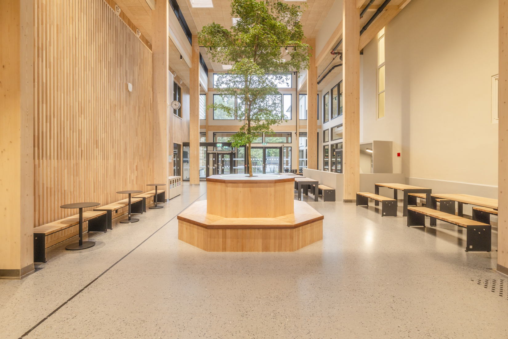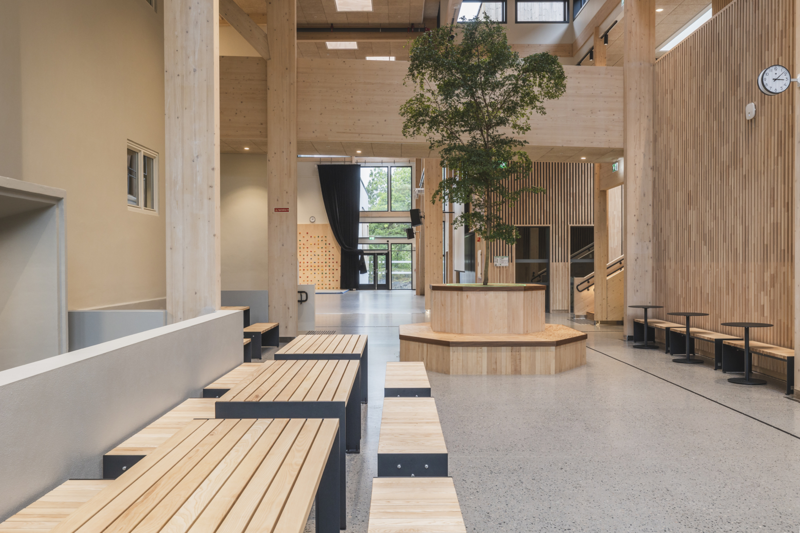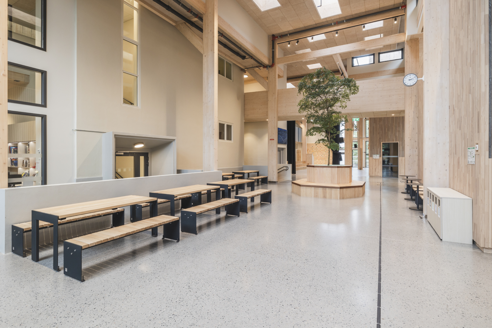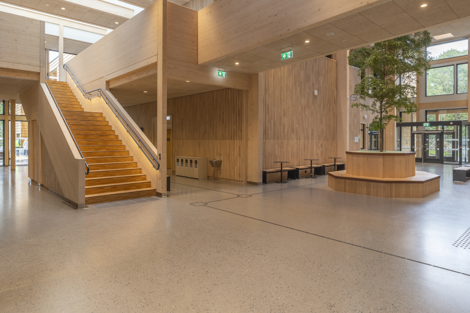 Bygget er utformet med fleksible læringsarealer, åpne fellesrom og høy teknisk kvalitet – alt med mål om å skape et inkluderende og inspirerende miljø for elever og ansatte.