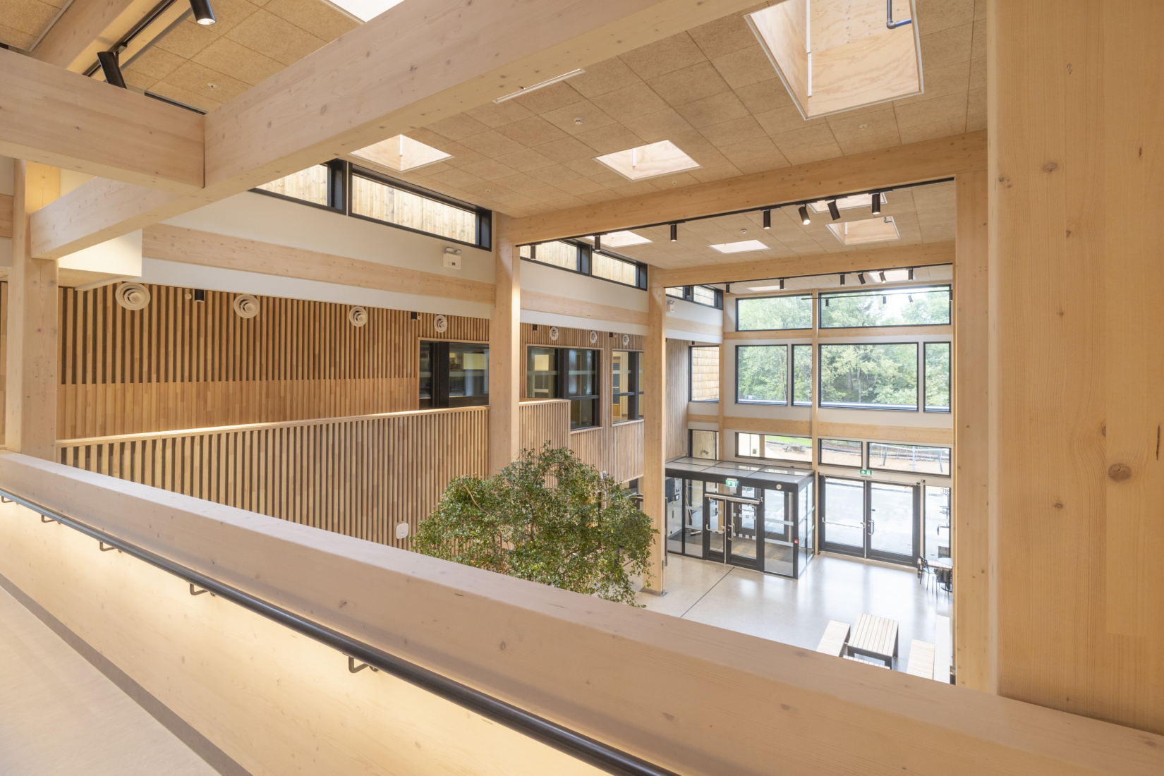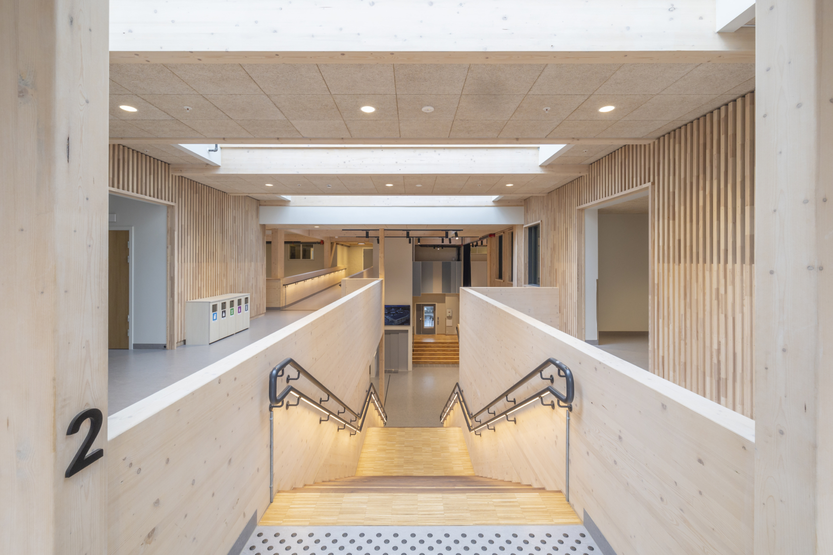 Det nye skolebygget inneholder både undervisningsrom og spesialrom, og er koblet sammen med eksisterende bygningsmasse via en sentral lysgård som skaper naturlig sammenheng og gode dagslysforhold.