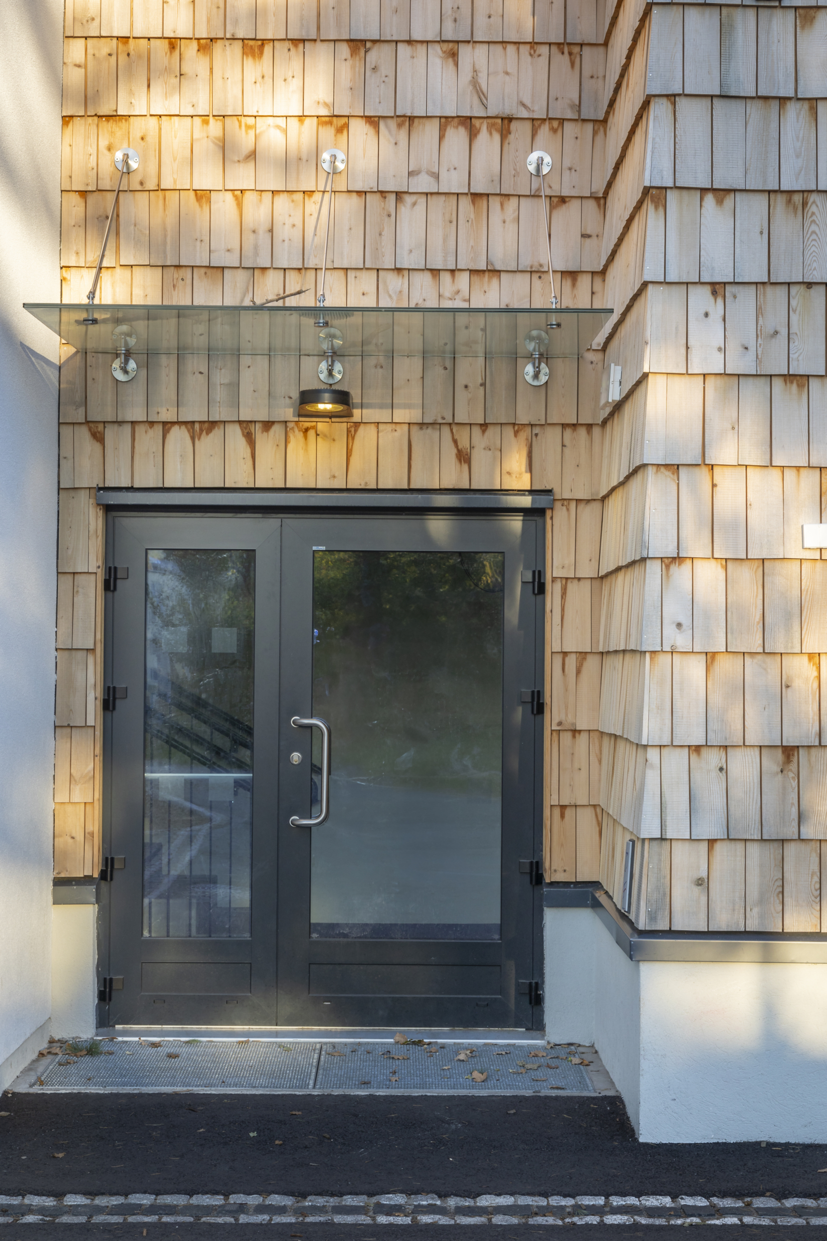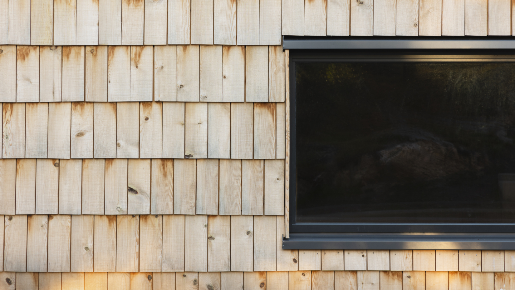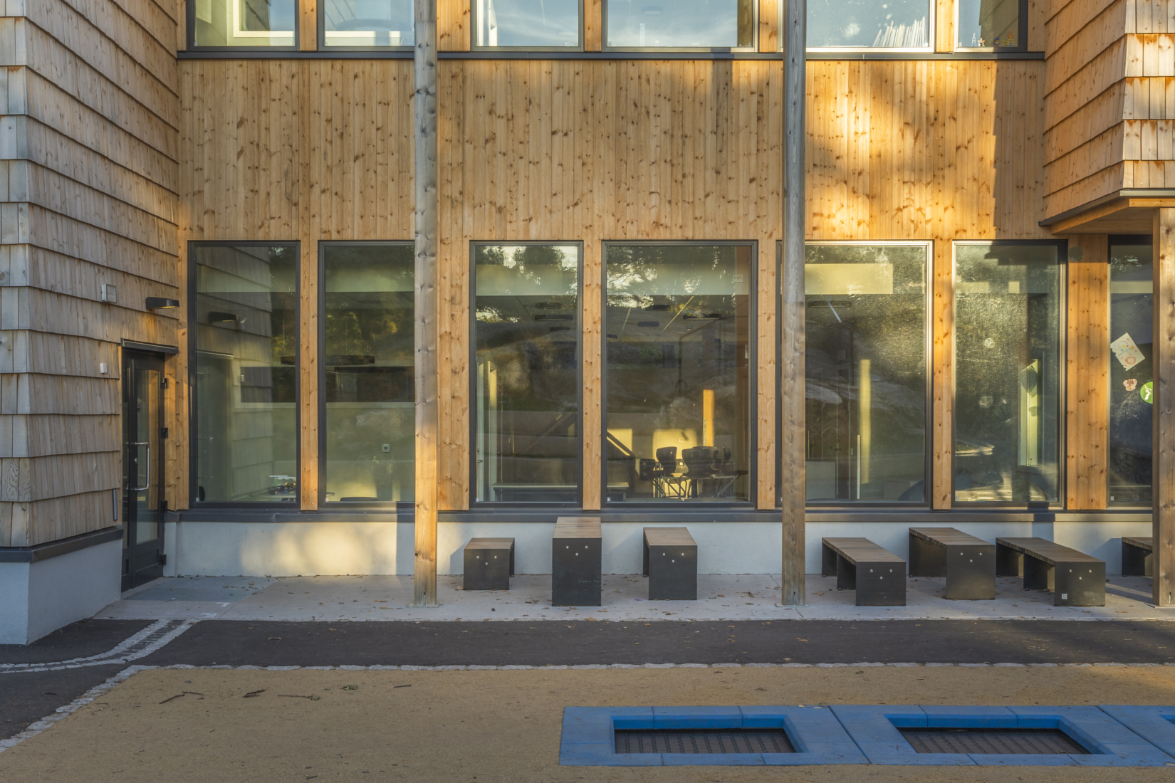 Fasaden er kledd med sponpanel som vil gråne over tid og gi bygget et levende og tidløst preg i samspill med omgivelsene.